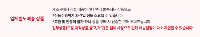 - 주문하신 상품은 상품 종류 및 배송지역에 따라 직배송, 택배, 업체 직납 등의 방식으로 진행됩니다.